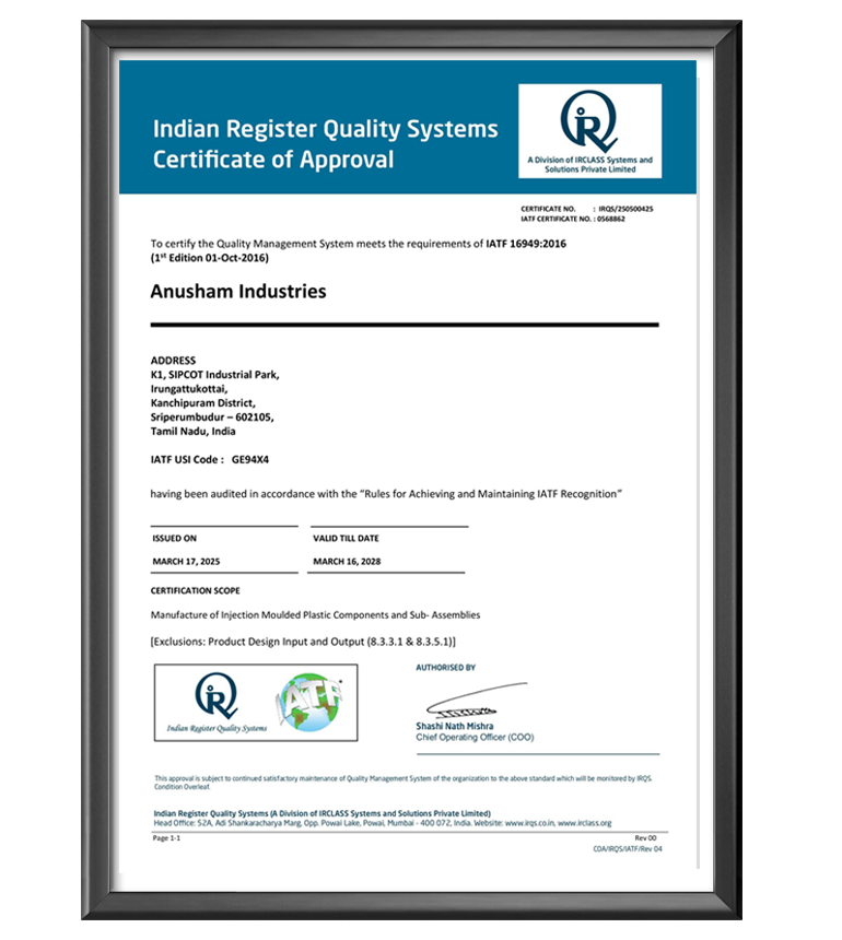 All Employees of Anusham Industries is Committed to Grow Continually by Delivering Plastic Injection Molded Quality Products to Automotive Industries towards Customer Delight.